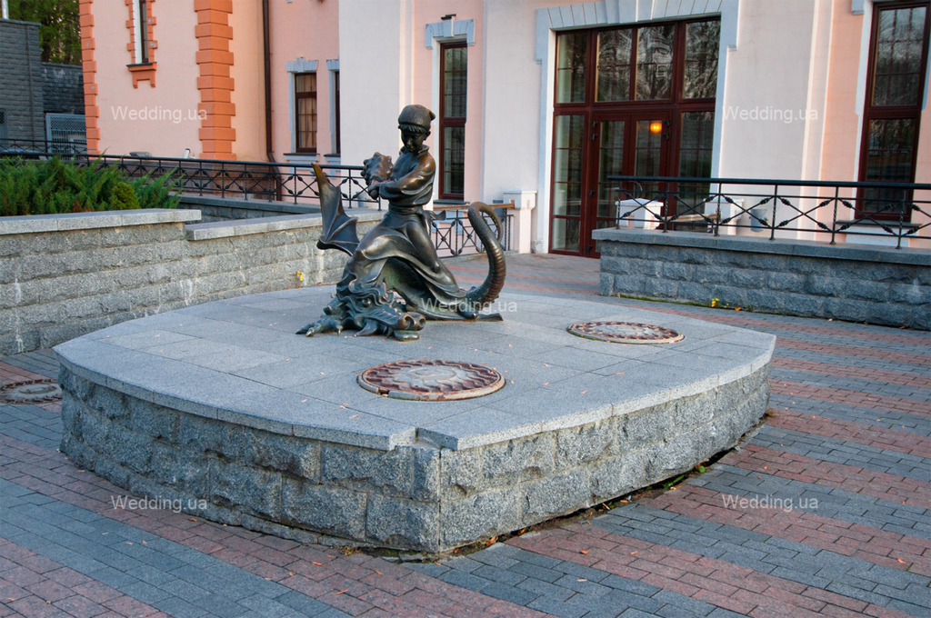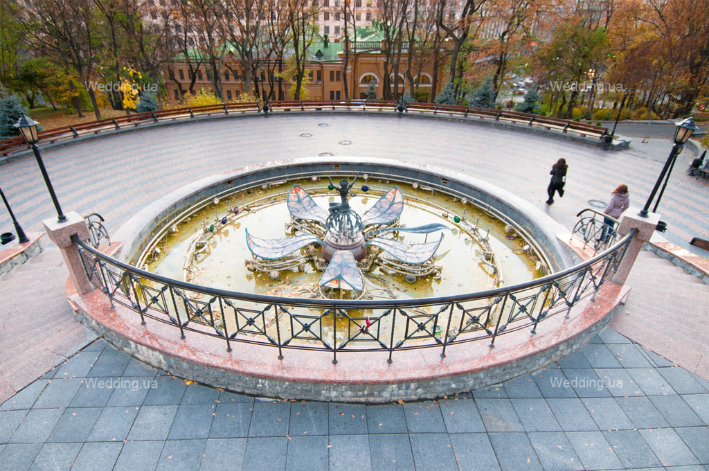 После фотосета внутри здания, обязательно продолжите на улице, у фасада замка. Здесь располагается красивейший и уникальный фонтан, во время работы которого, водные композиции меняются под музыкальное сопровождение. Сказочные персонажи перенесут Вас в мир волшебной радуги, фантазий и беззаботности. Подружитесь с Дюймовочкой, внимательно рассмотрите волшебный ключик Буратино, – насладитесь, ведь в нашей жизни так сало место отводится чудесам! Поэтому, свадебная фотосессия возле Киевского государственного театра кукол – это лучший шанс вернуться в детство!